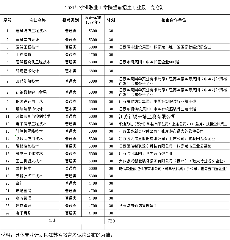 2021年沙洲职业工学院提前招生专业及计划出炉啦!设有24个提前招生专业,共招收720人,一起来看看吧!注:本文内容来源沙洲职业工学院,由江苏招生考试网团队(微信公众号:jszkwx)综合整理,如有侵权,请及时联系管理员删除。