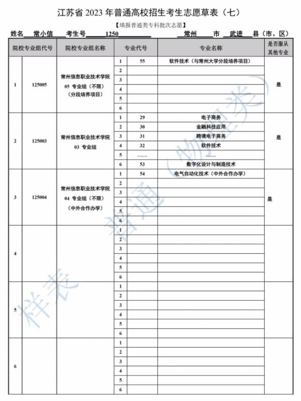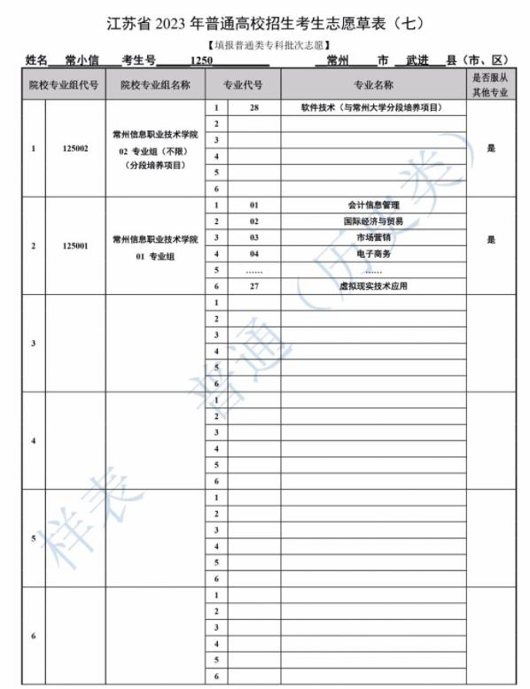 注:由于篇幅有限,样表并未截全,江苏普通文理考生可填40所院校科目组,艺术类考生可填写20所院校科目组。