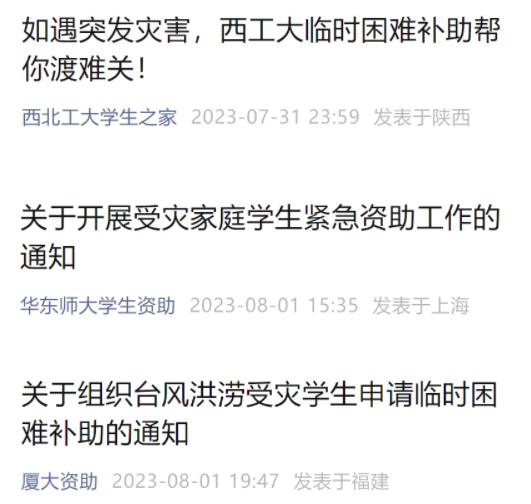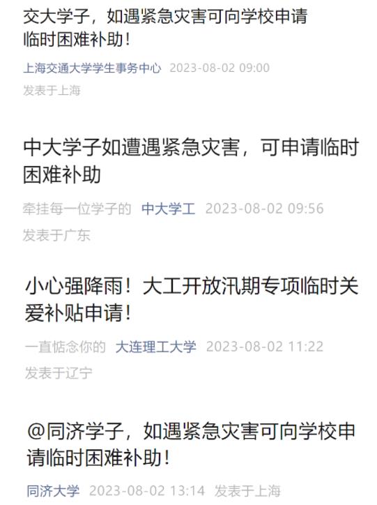 近日,多地出现强降雨天气,部分地区汛情严重。西北工业大学、华东师范大学、厦门大学、上海交通大学、中山大学、大连理工大学、同济大学等高校相继发声:受灾学生可向学校申请补助。